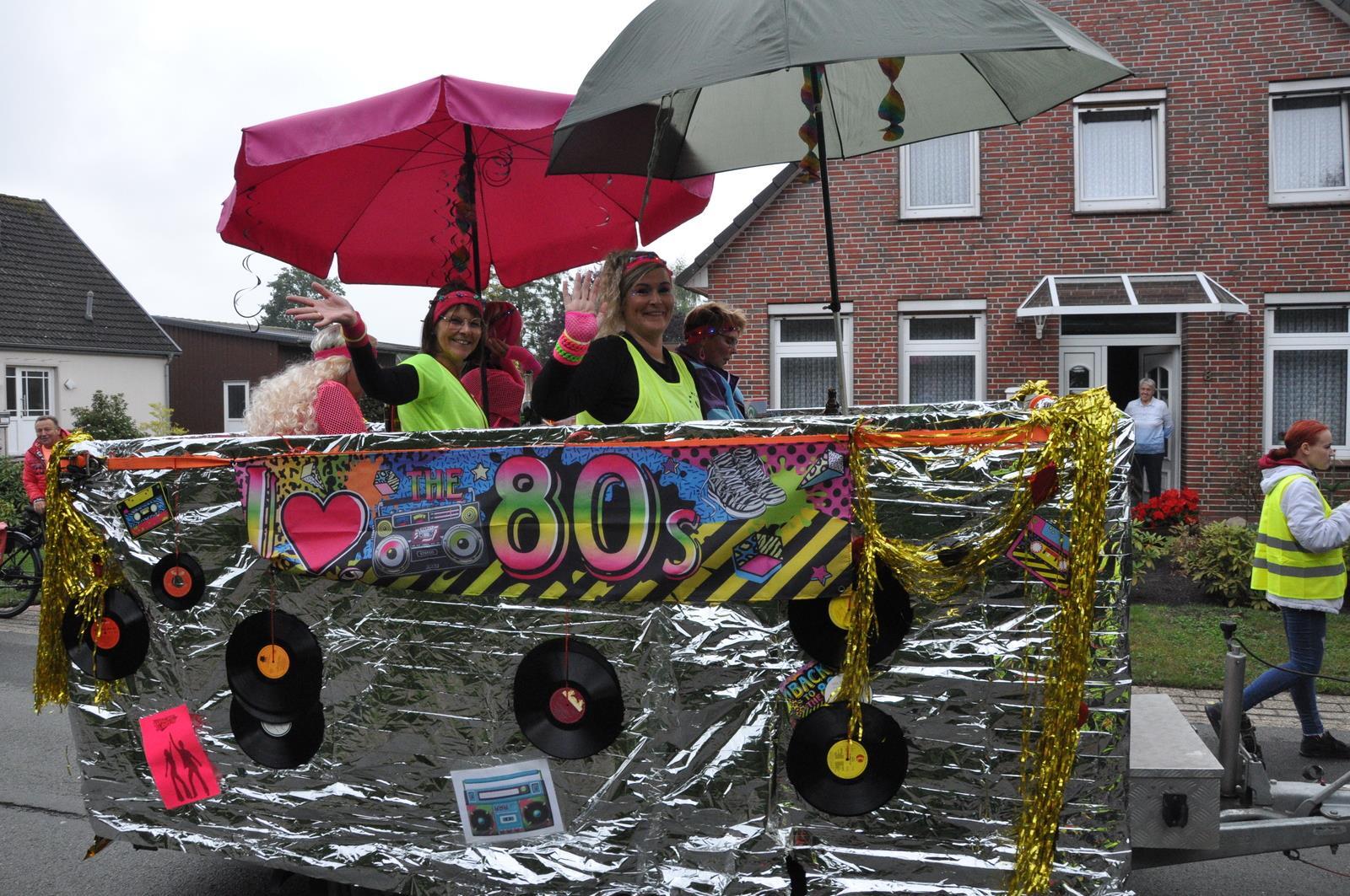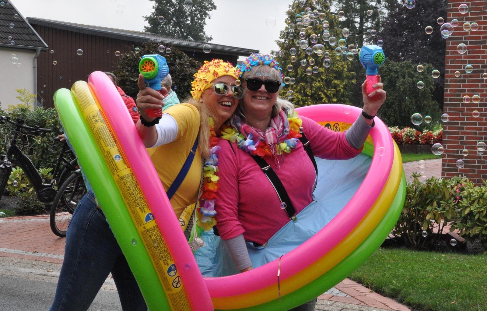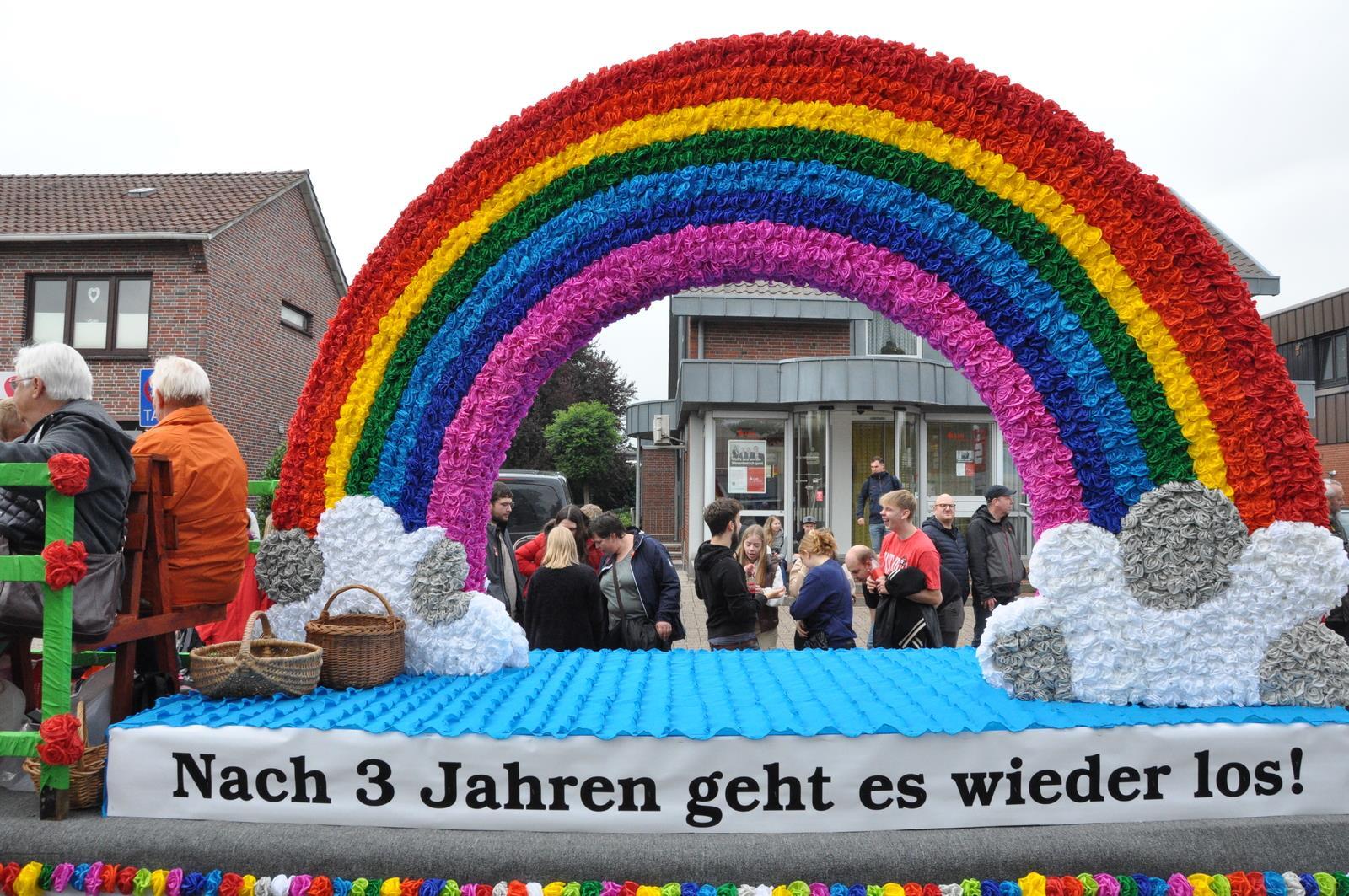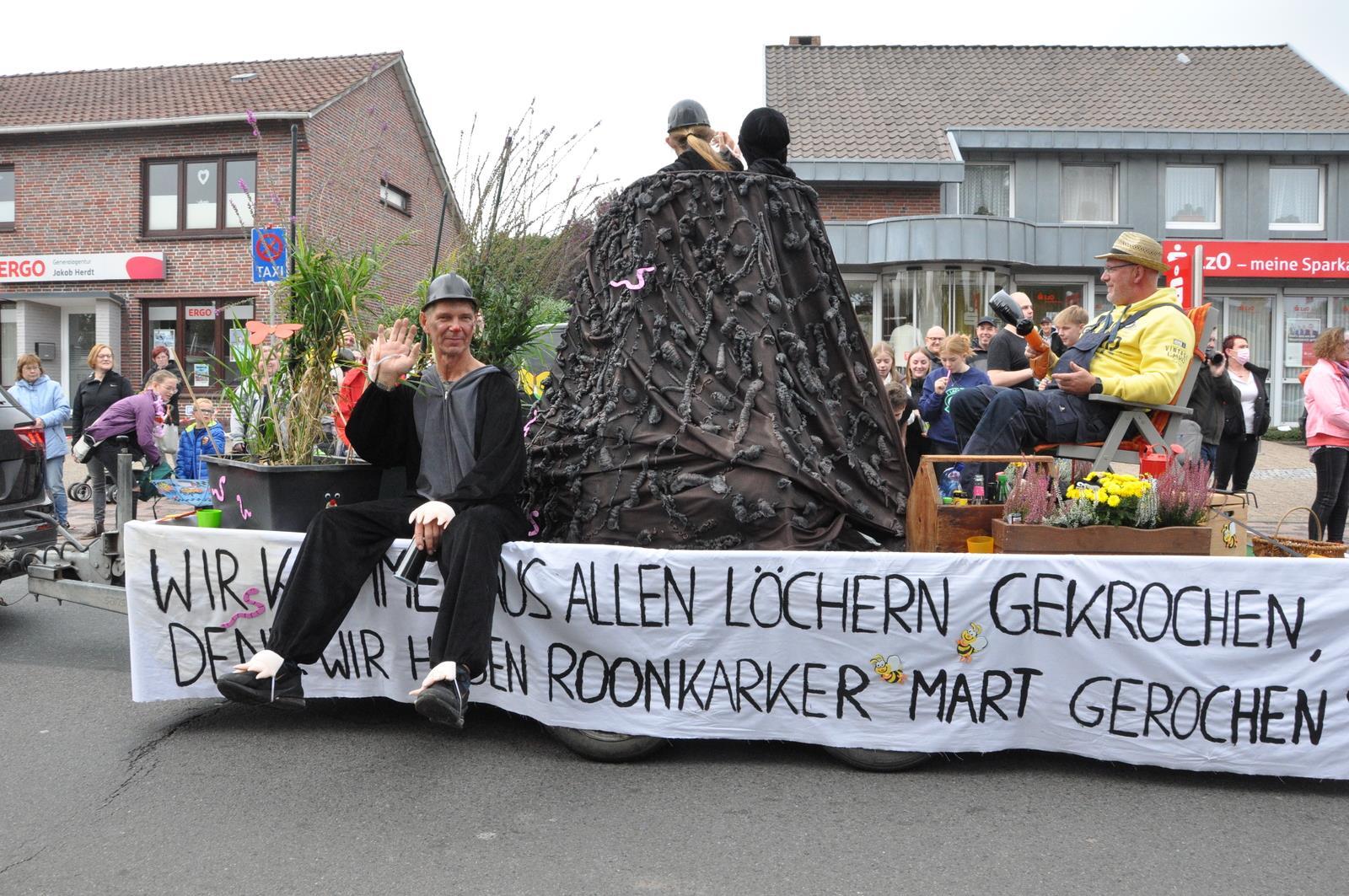 Auf dem Wagen des Bürgervereins Strohausen steht „Nach drei Jahren geht es wieder los“. Auf einem anderen: „Wir kommen aus allen Löchern gekrochen, denn wir haben Roonkarker Mart gerochen“. Die Leute sind glücklich, wieder feiern zu können.