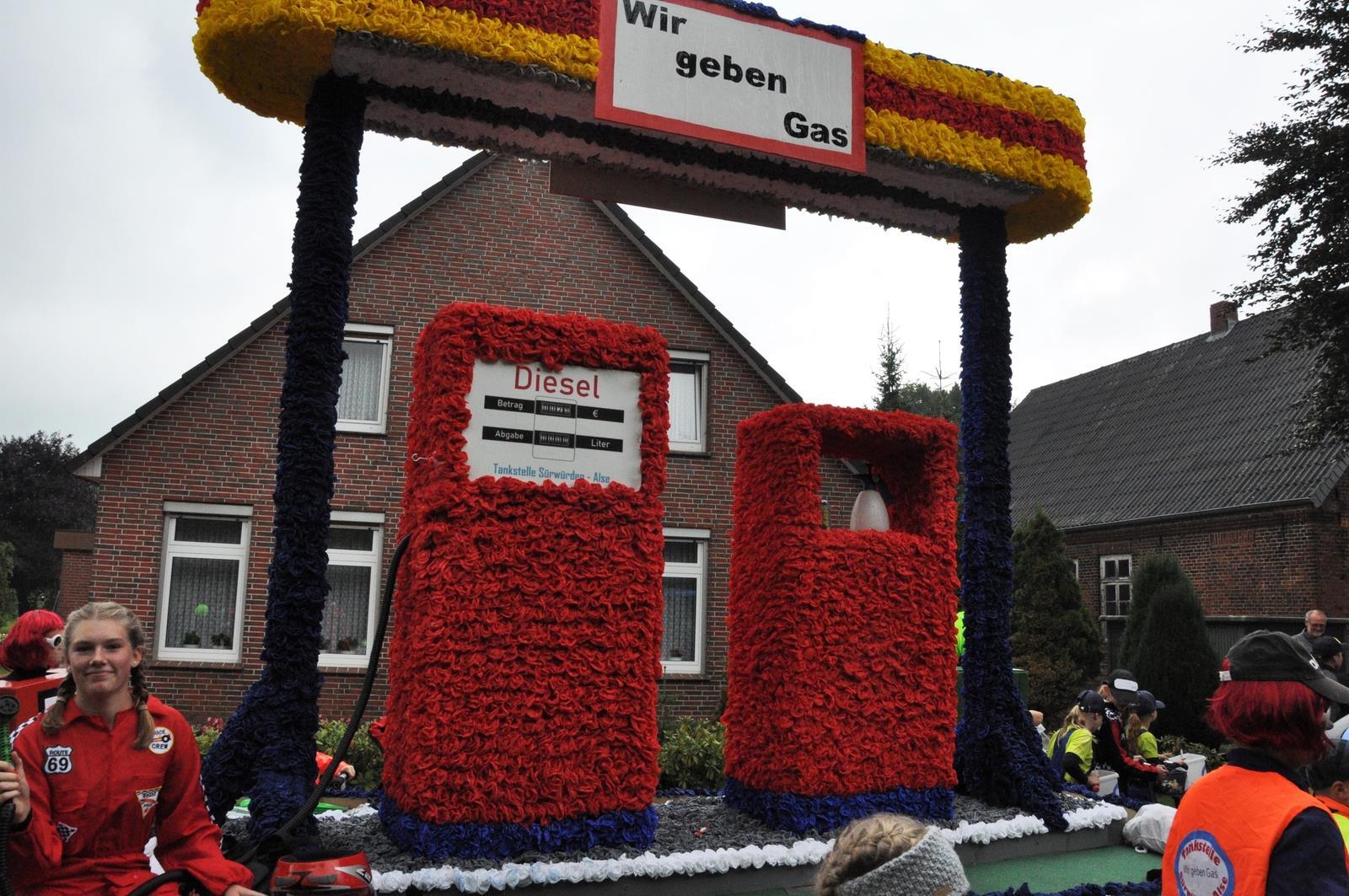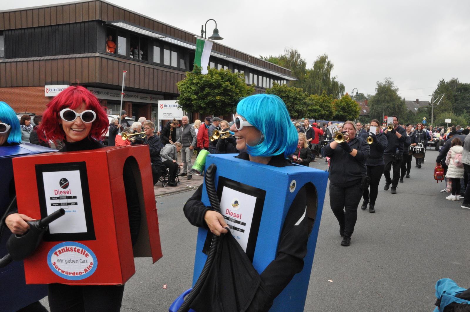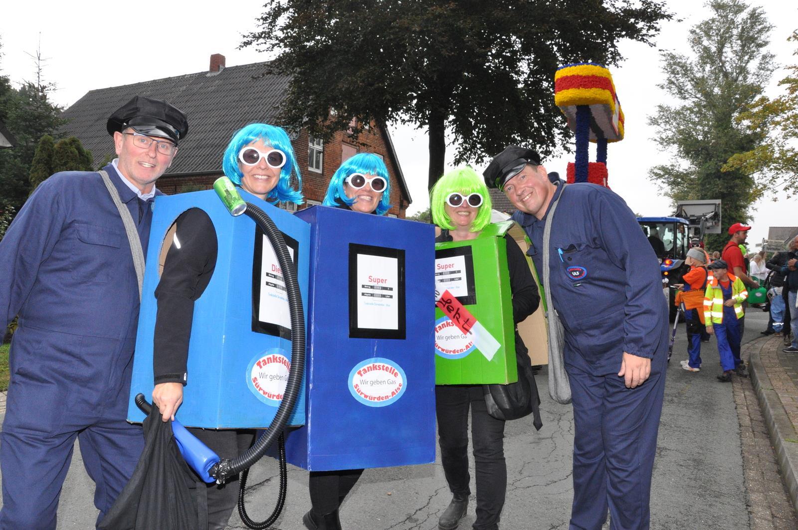 Der Bürgerverein Sürwürden-Alse nimmt die hohen Spritpreise aufs Korn. Mitglieder haben sich als Zapfsäulen verkleidet. Sieht klasse aus. Und hat bei der Prämierung Platz 2 gebracht.
